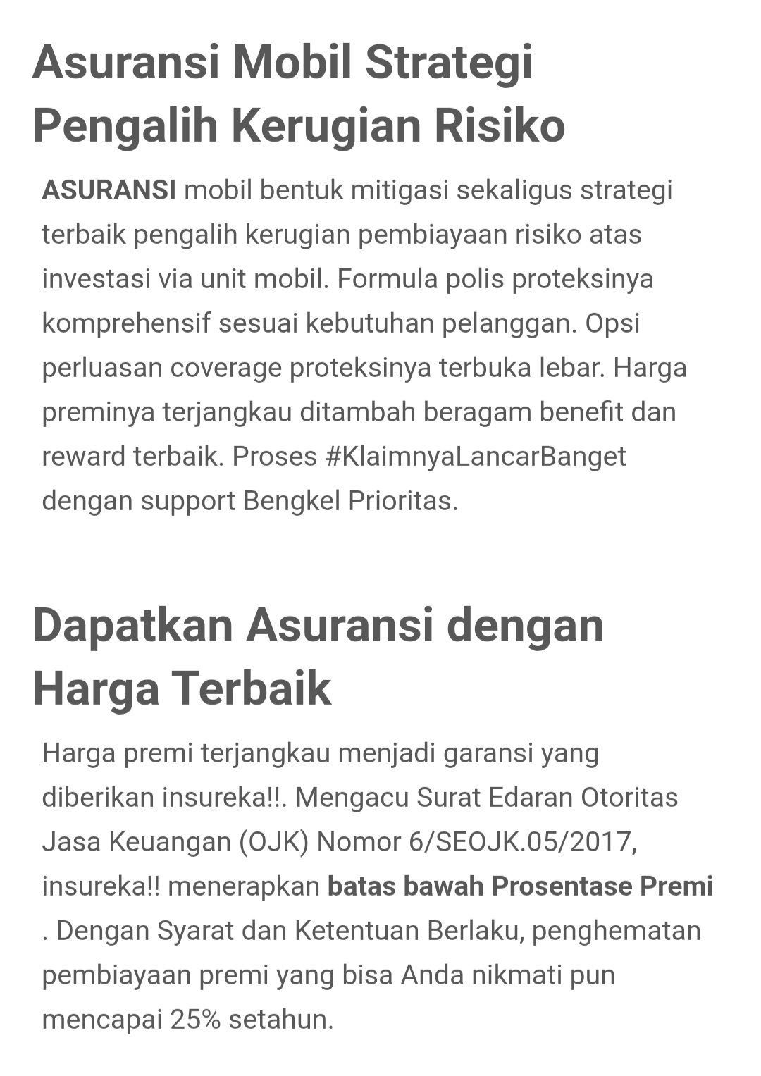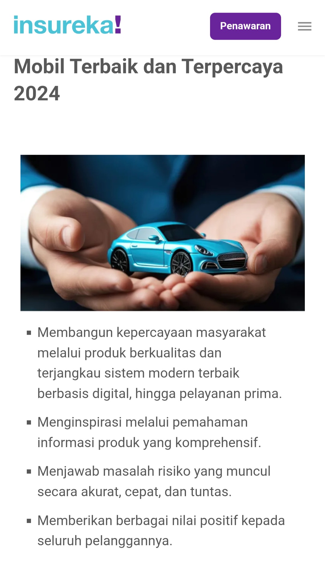 ASURANSI mobil bentuk mitigasi sekaligus strategi terbaik pengalih kerugian pembiayaan risiko atas investasi via unit mobil. Formula polis proteksinya komprehensif sesuai kebutuhan pelanggan. Opsi perluasan coverage proteksinya terbuka lebar. Harga preminya terjangkau ditambah beragam benefit dan reward terbaik. Proses #KlaimnyaLancarBanget dengan support Bengkel Prioritas.