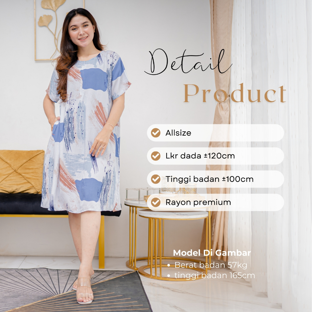 Didesain dengan potongan kaftan yang longgar (jumbo / oversized), daster ini memberikan keleluasaan bergerak maksimal. Dibuat dari bahan pilihan Rayon Premium / Katun Rayon / Twill (pilih bahan yang Anda gunakan) yang terkenal super adem, halus, dan menyerap keringat, cocok untuk iklim tropis Indonesia.