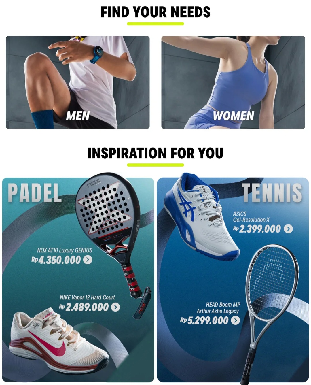 Temukan berbagai perlengkapan olahraga terbaik untuk menunjang aktivitasmu! Dari sepatu lari, pakaian olahraga, yoga mat, hingga perlengkapan gym – semua tersedia dengan kualitas premium dan harga terjangkau.